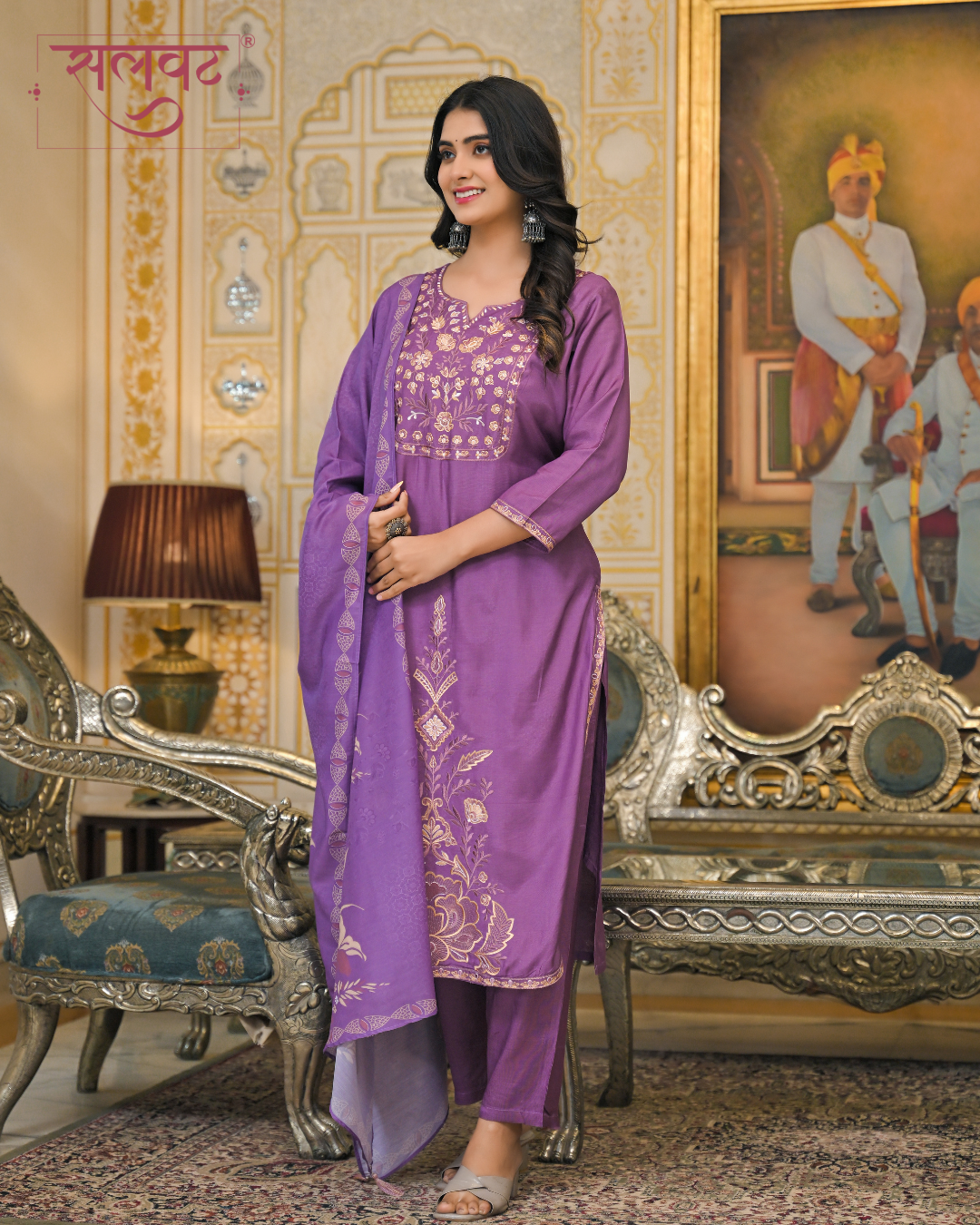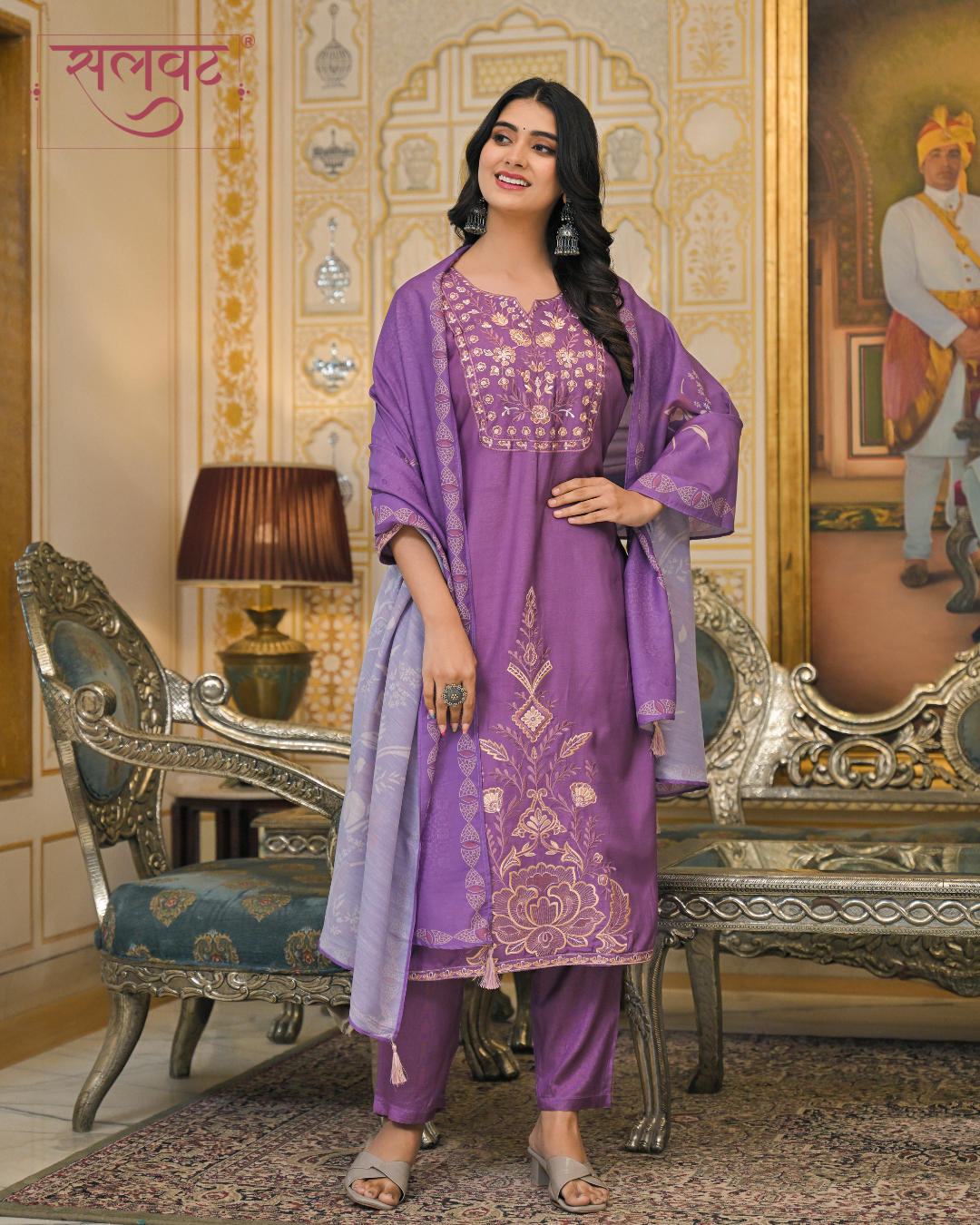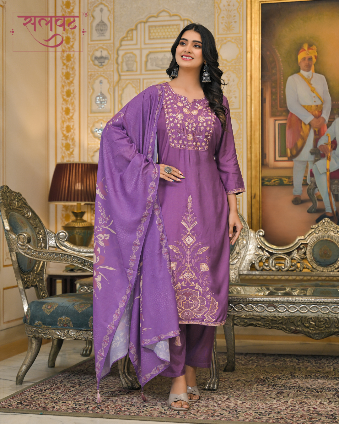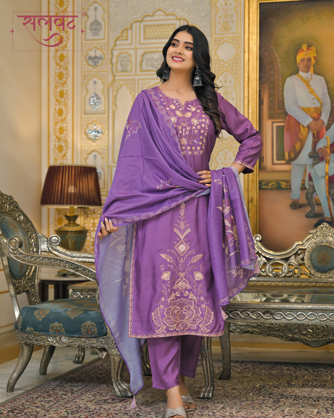 This Plum Purple hand-dyed center placement muslin thread embroidery kurta with pants & elegant digital printed dupatta,