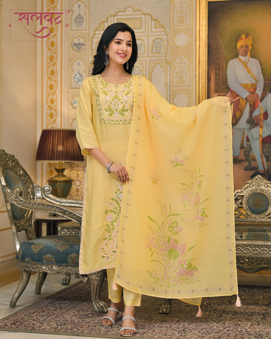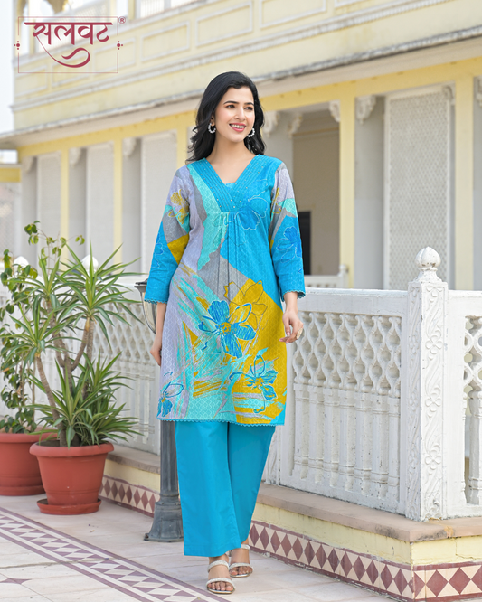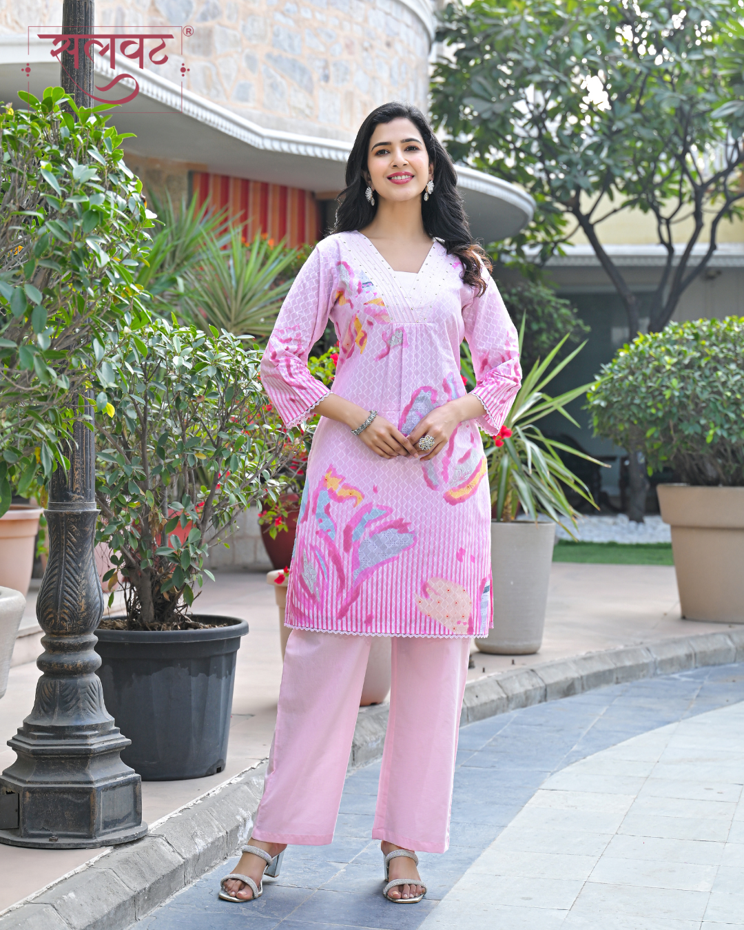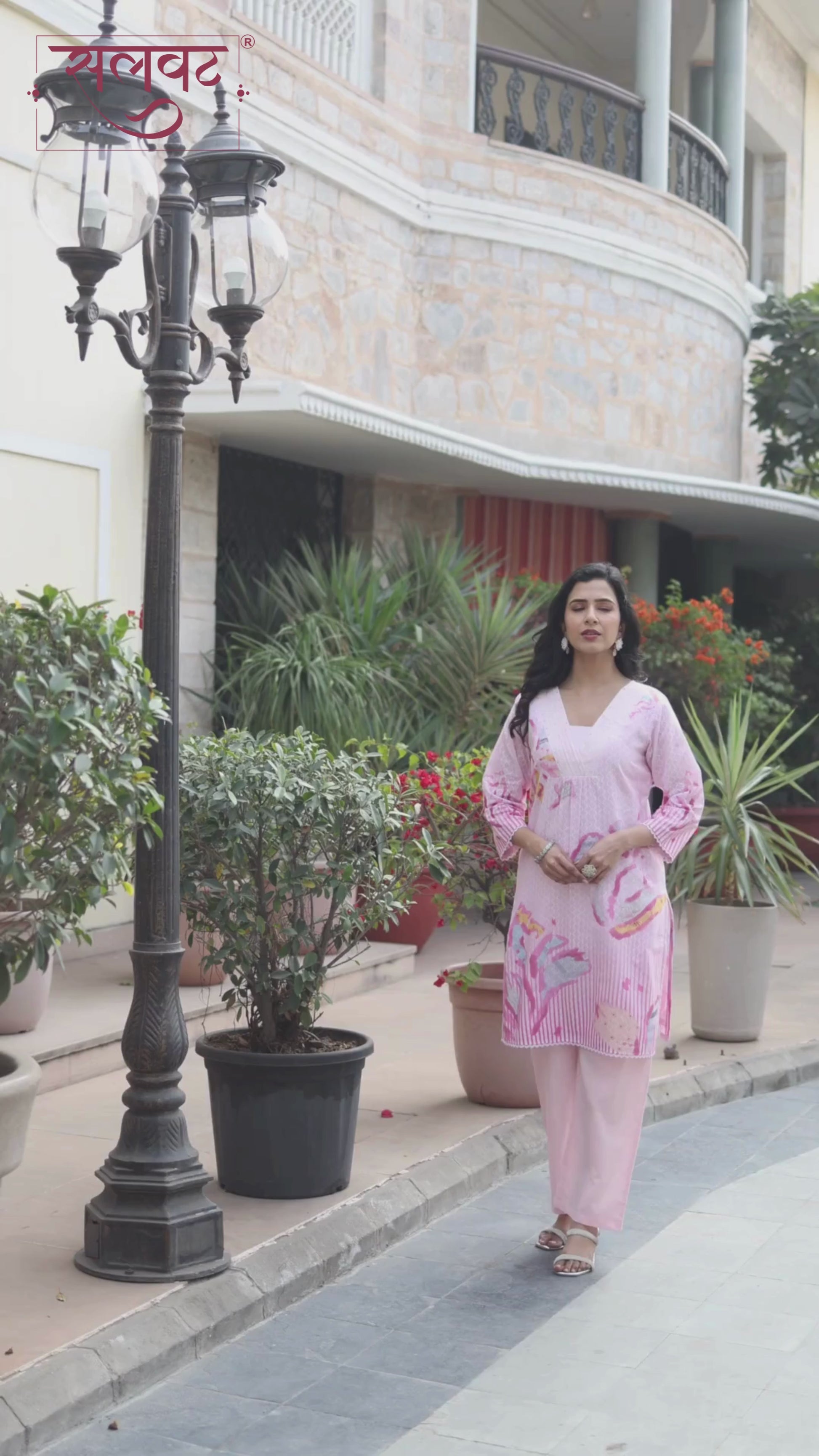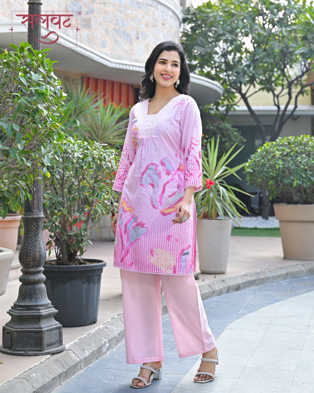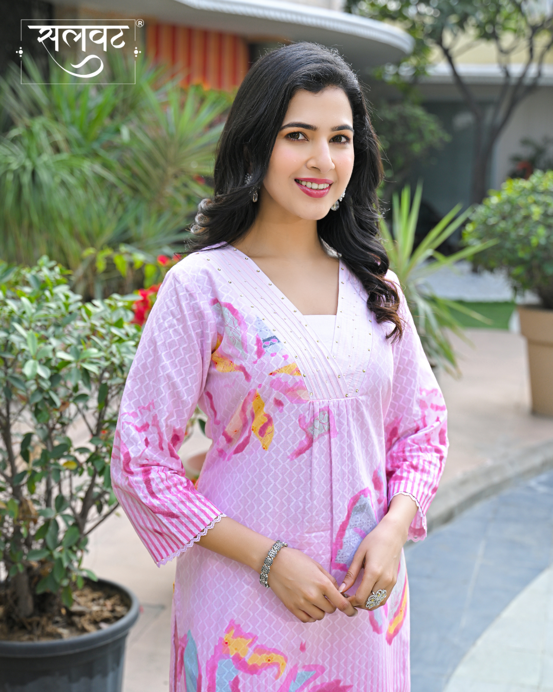 Powder Pink abstract flowers printed kurta set with pin tuck beads-sequins handwork .