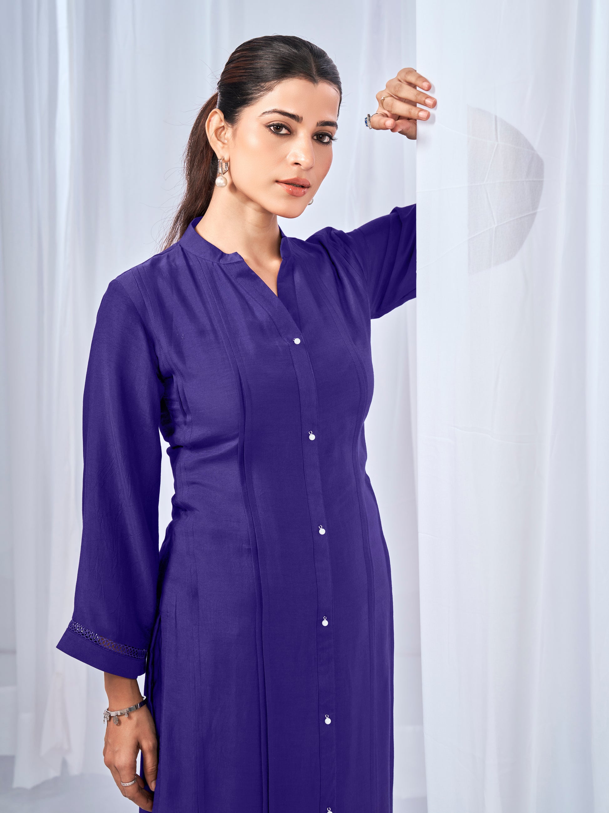 Stylish solid purple kurta and trousers set featuring pearl buttons along the neck and delicate side stitch patterns. The sleeves are highlighted with lace accents, making it ideal for casual, office, or semi-formal wear.