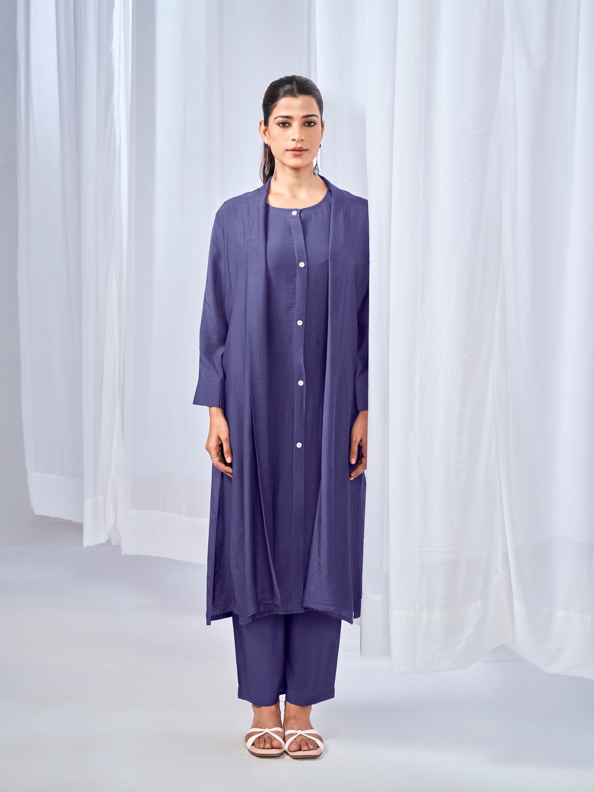 Stylish purple kurta, pants, and full-sleeve jacket set, featuring a buttoned kurta that can be worn as cut sleeves. The full-sleeve jacket adds elegance and structure, making this set perfect for casual outings, office wear, festive events, or semi-formal events.