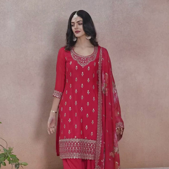Red Chinon Fabric Top with Floral Pattern Sequins work & Heavy Embroidered Border on Daman & sleeves. Paired with Chinon fabric Sharara with Sequins Embroidered and Bemberg Chiffon Digital Floral Printed Dupatta & Four Sided Sequins Embroidered Scalloped Border