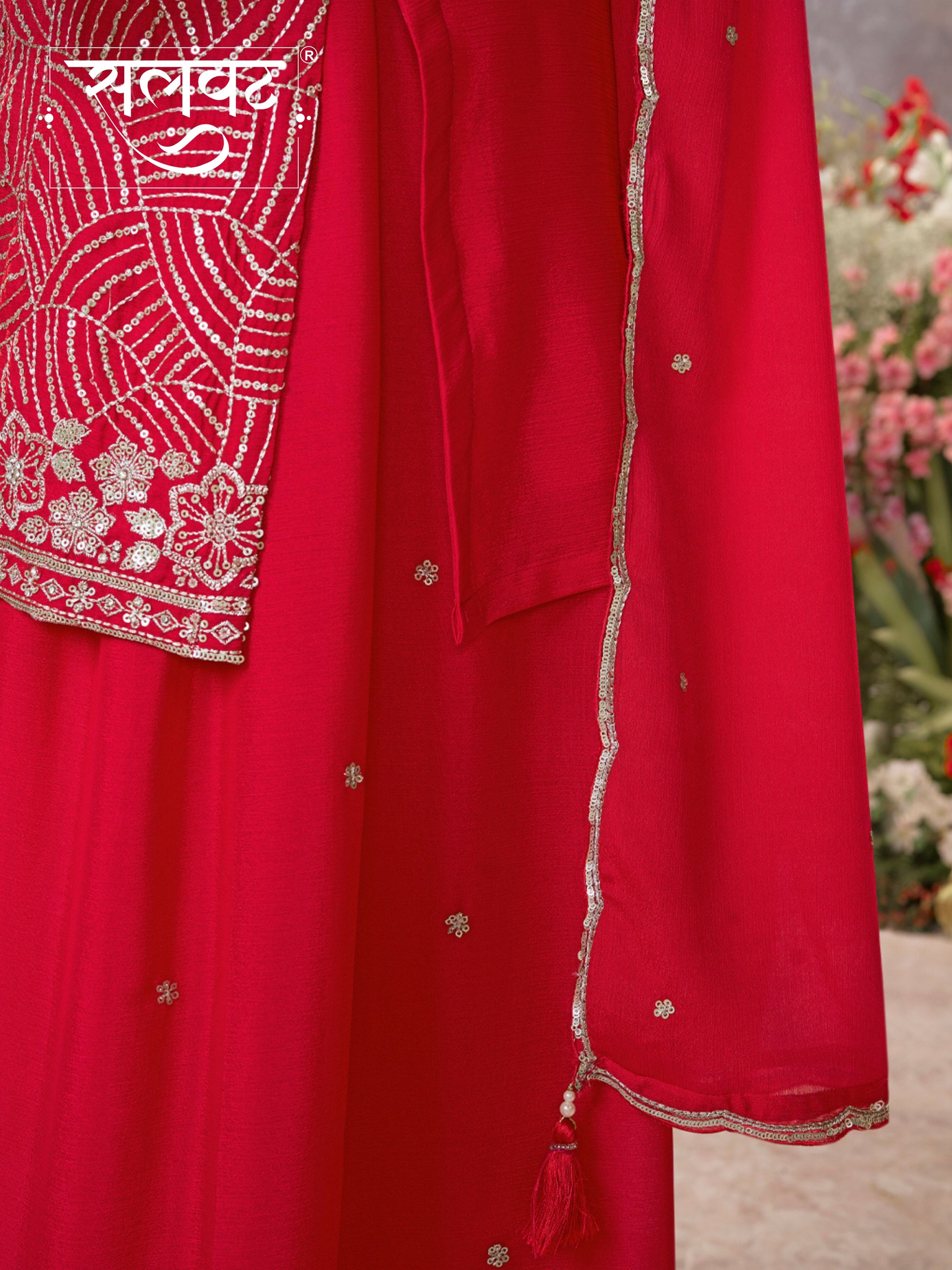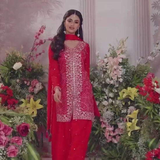 Make a statement with this elegant Red Chinon Sharara Suit featuring delicate embroidery and sequins work. The set includes a matching Chinon sharara and a beautifully crafted Chinon dupatta adorned with butti work and scalloped sequin borders, adding charm and grace to any festive or wedding occasion.