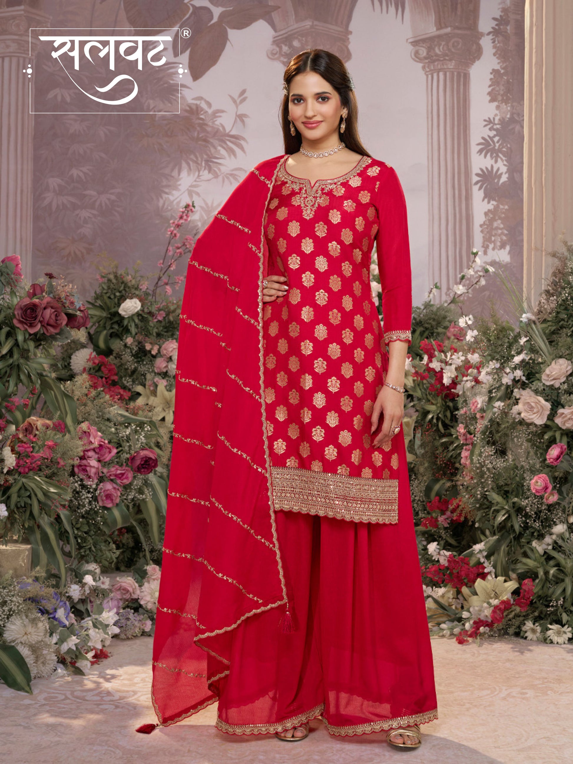 Red Dola Silk, This Top Features Meena Jacquard Detailing With An Embroidered Scalloped Border On The Yoke And Daman. Paired With A Chinon Sharara Showcasing Matching Scalloped Embroidery. Comes With A Chinon Jhalar Dupatta, Finished With A Four-Sided Scalloped Embroidered Border.