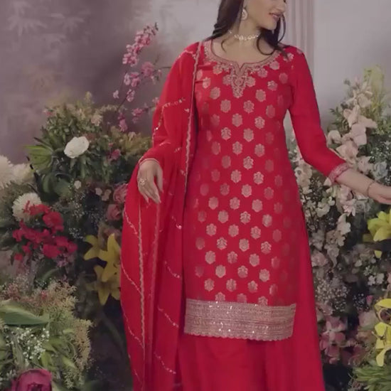 Red Dola Silk Meena Jacquard Kurta Set Paired With Embroidered Sharara Suit Set