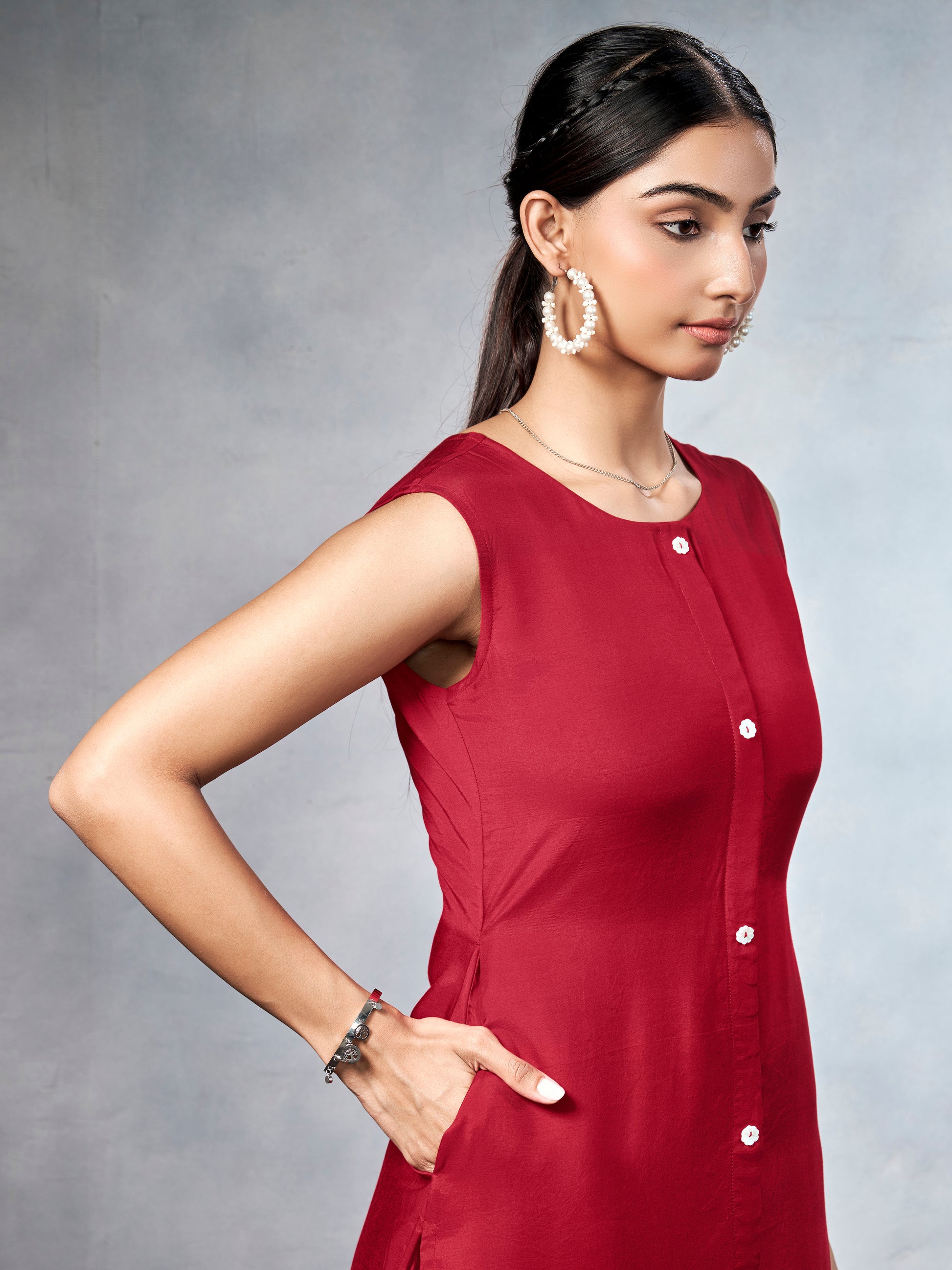 Elegant Red three-piece co-ord set featuring a kurta, pants, and a full-sleeve jacket. The kurta can be styled as cut sleeves and is adorned with buttons down the front, adding a sophisticated touch. The full-sleeve jacket elevates the overall look, making this set perfect for casual outings, office wear, or semi-formal occasions.