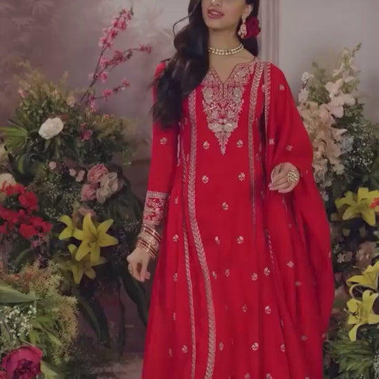 This Red Vichitra Silk Kurta Suit Set showcases elegant embroidered work on the kurta, paired with comfortable Viscose Santoon bottoms. The look is completed with a matching Vichitra Silk dupatta adorned with intricate embroidery, making it a graceful choice for festive occasions and celebrations.