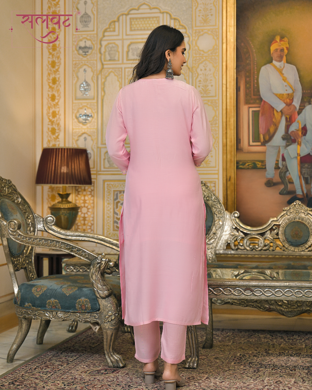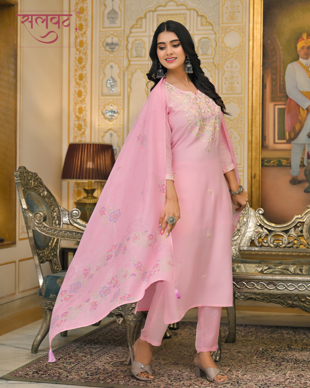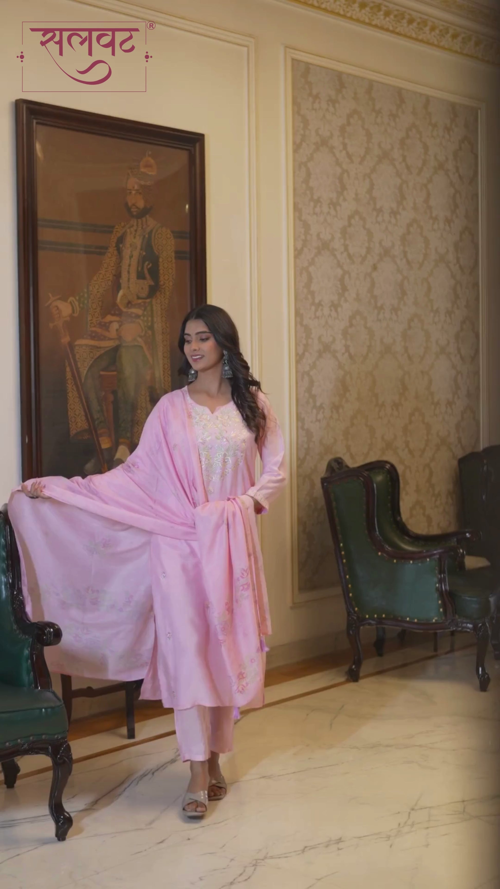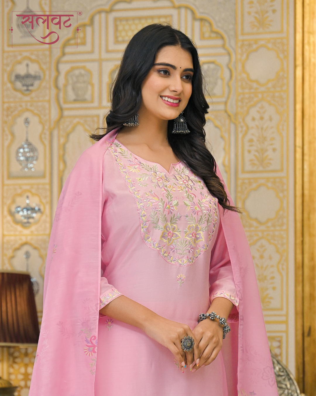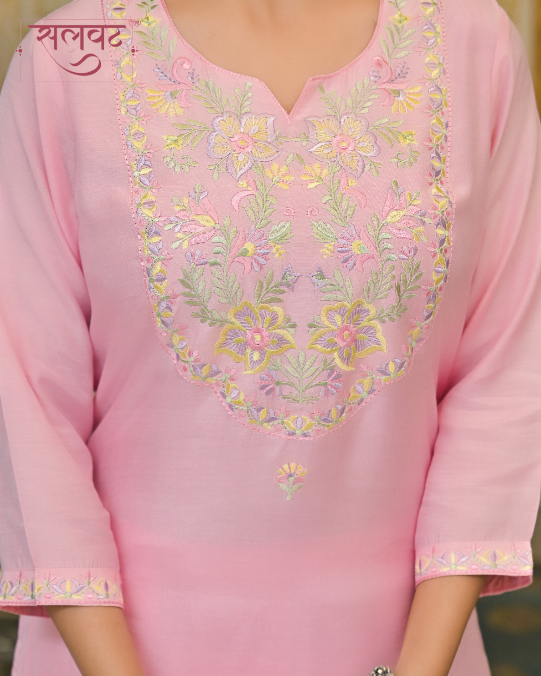 Rose Quartz Embroidered Kurta Set With Printed Dupatta