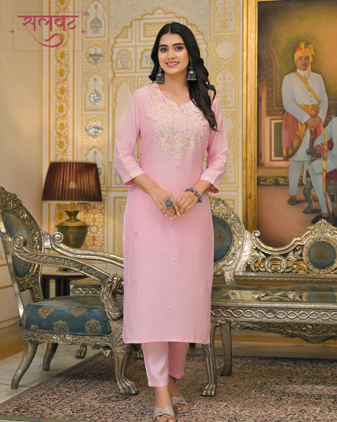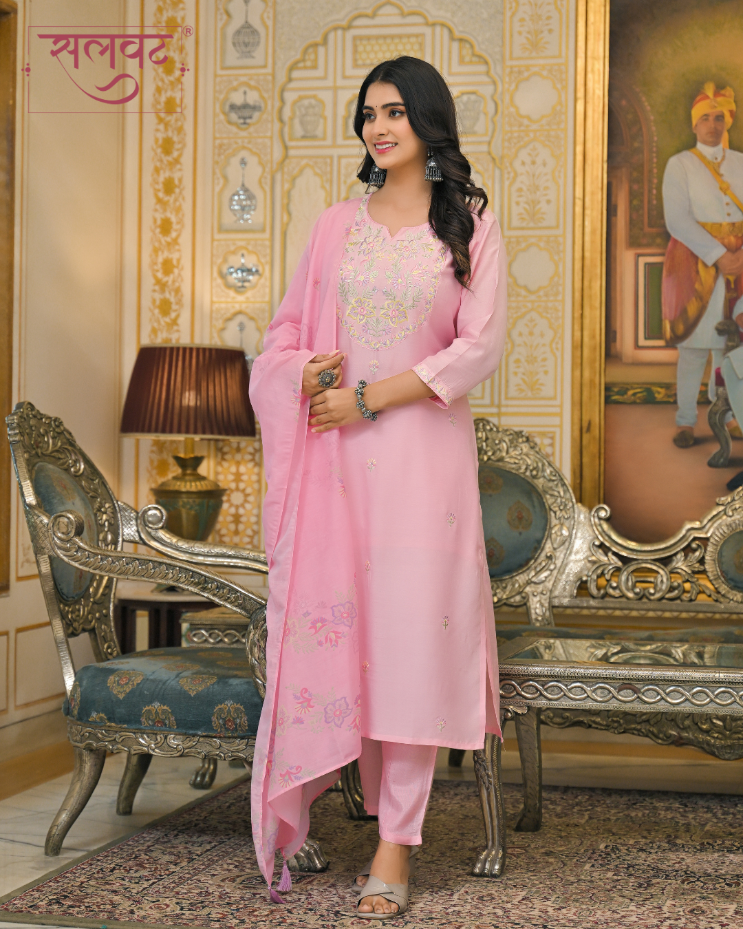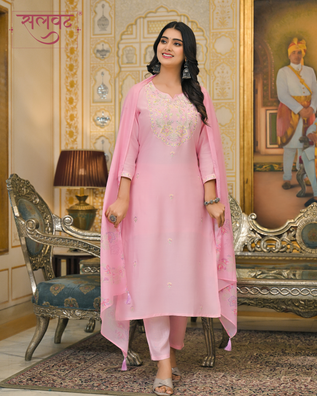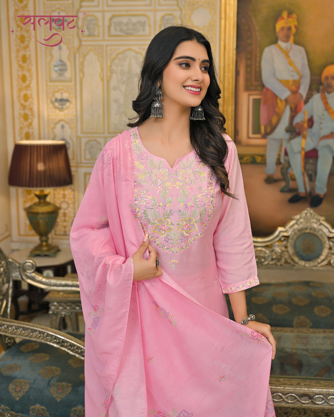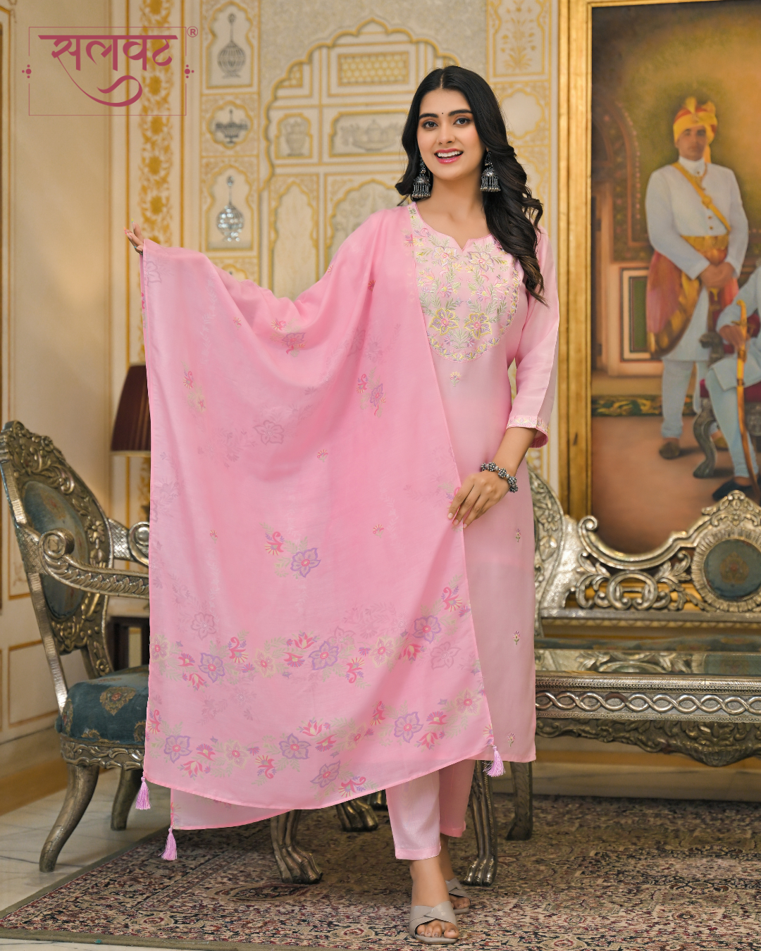 Rose Quartz Embroidered Kurta Set With Printed Dupatta