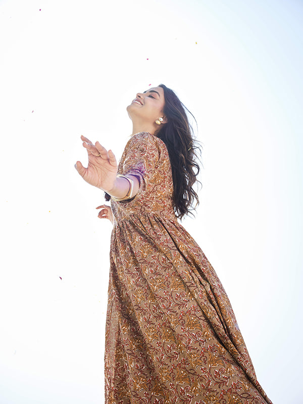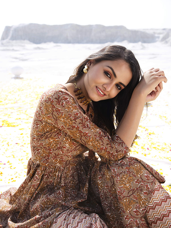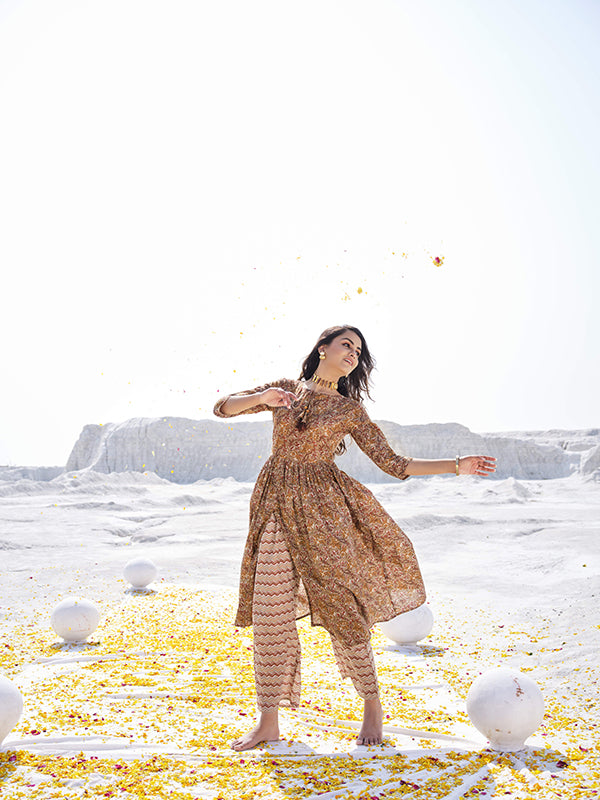 Hand printed brown petals and leaves flared kurti with a keyhole neckline and zigzag handprinted pants.