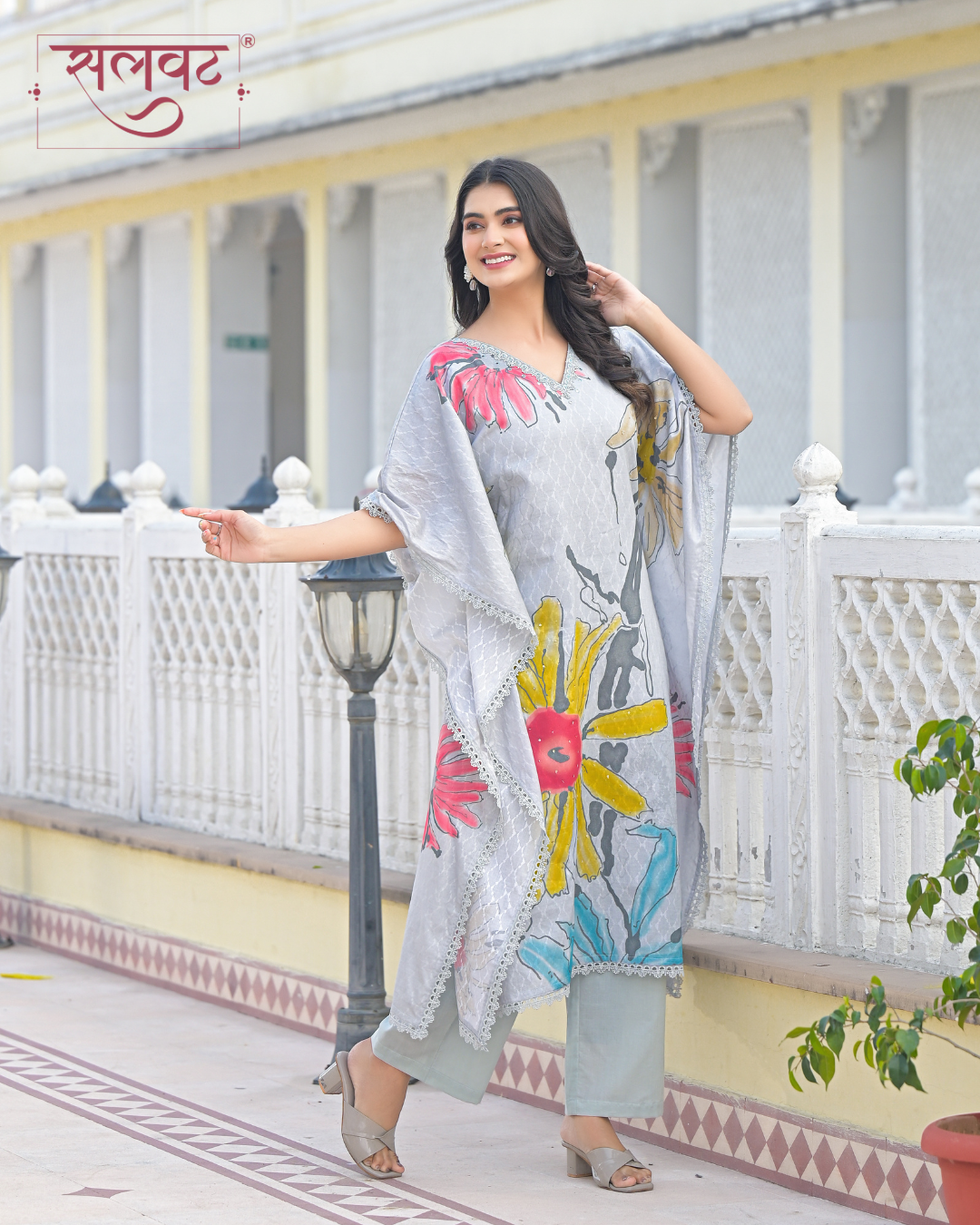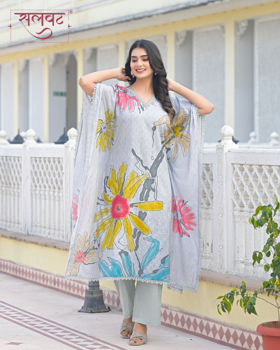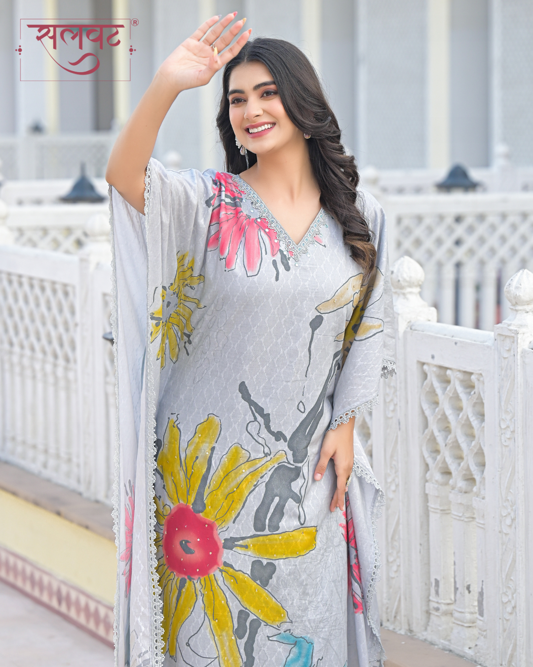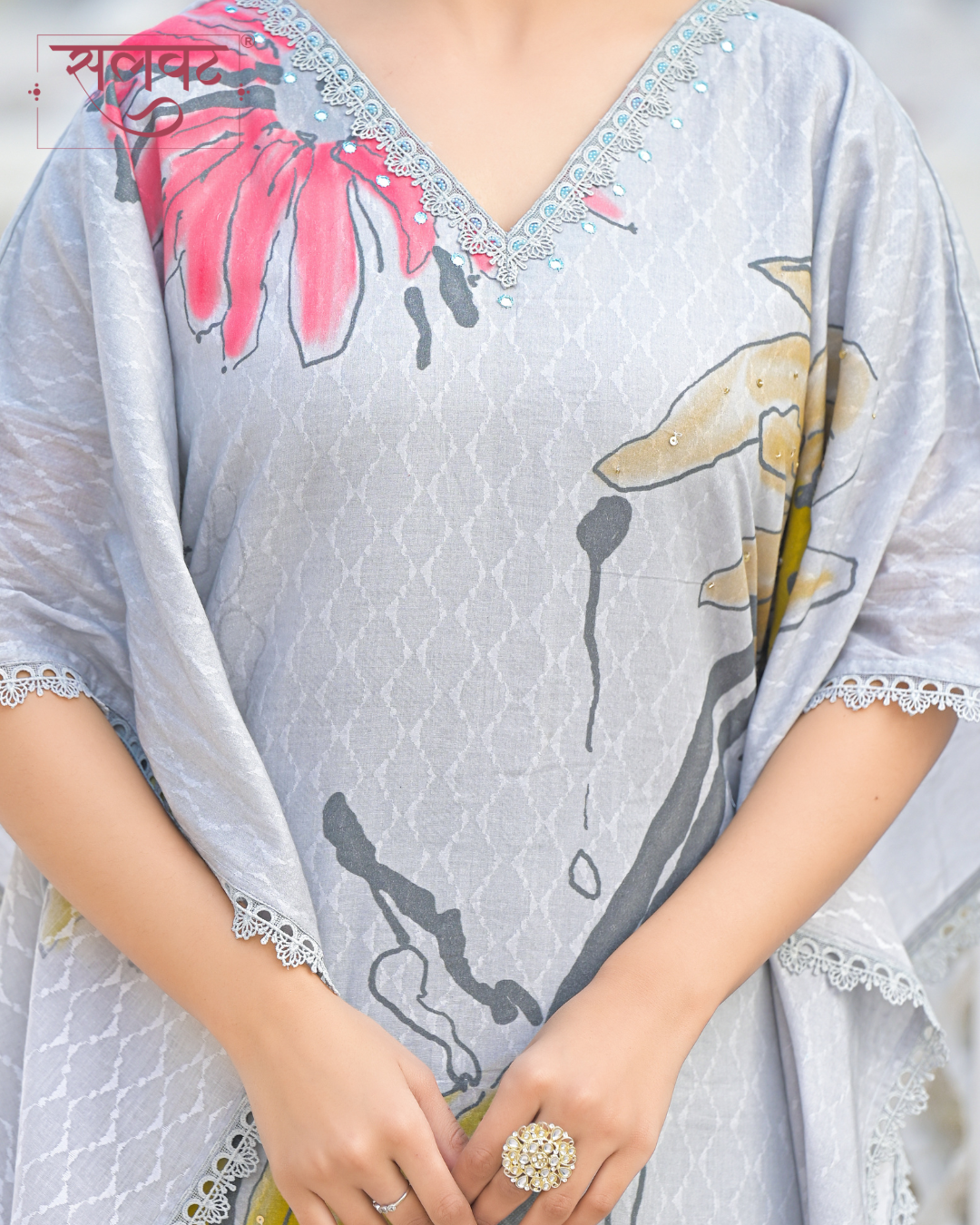 Slate Grey Abstract Printed Handwork Kaftan Set