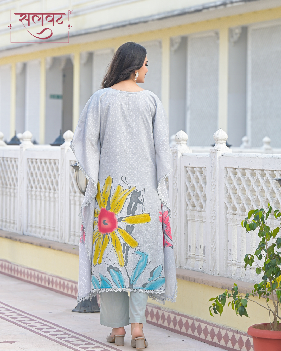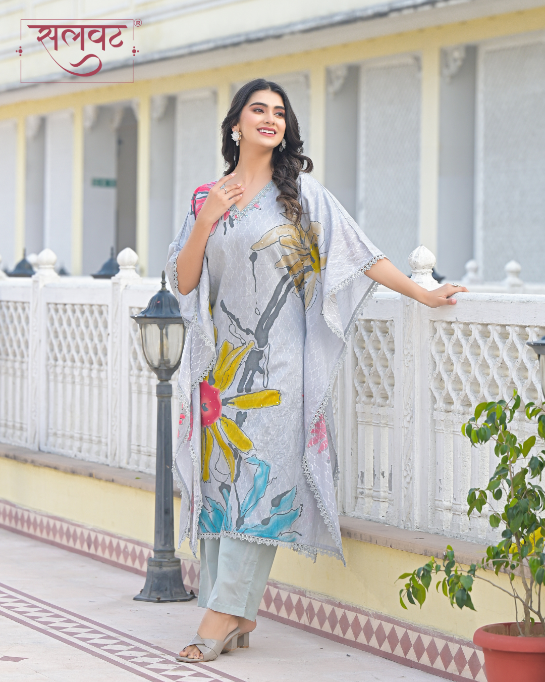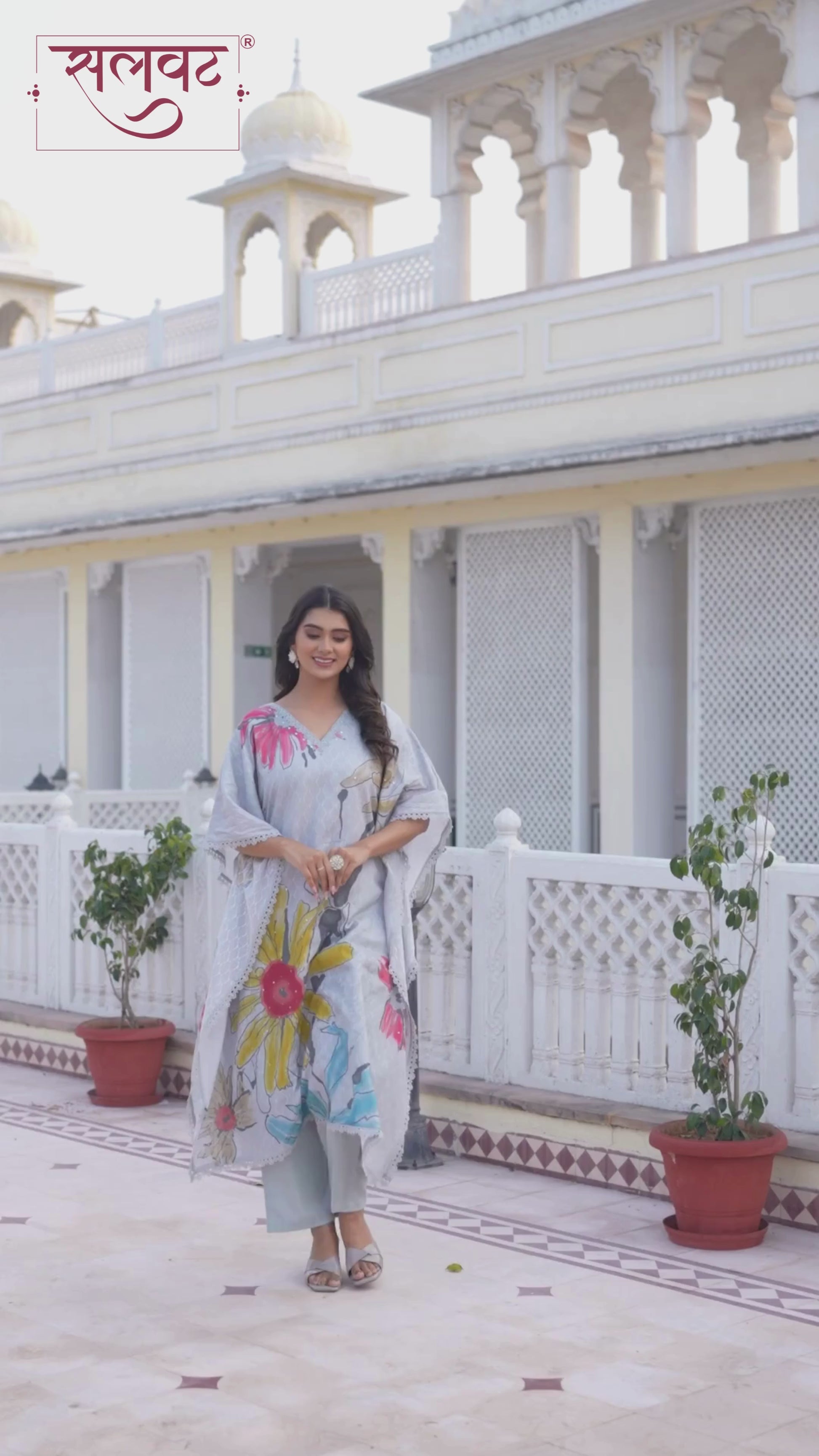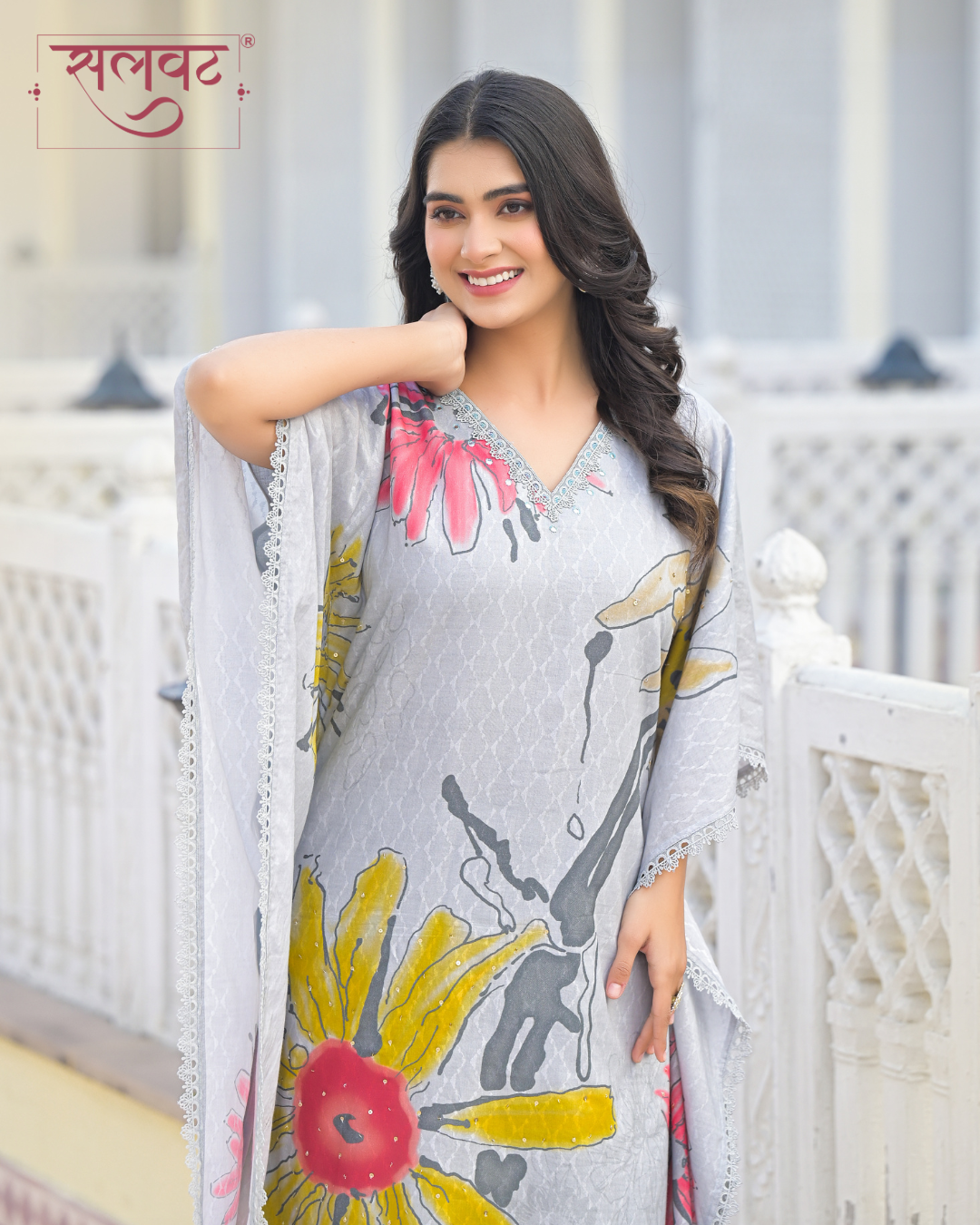 Slate Grey Abstract Printed Handwork Kaftan Set