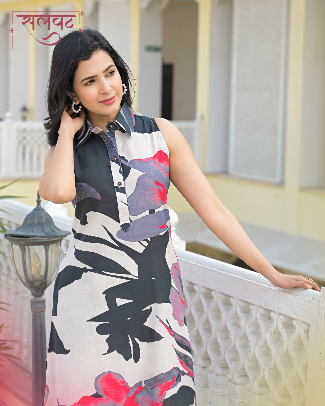 Slate Grey & Cream Abstract Pink Flowers Printed Kurta Set