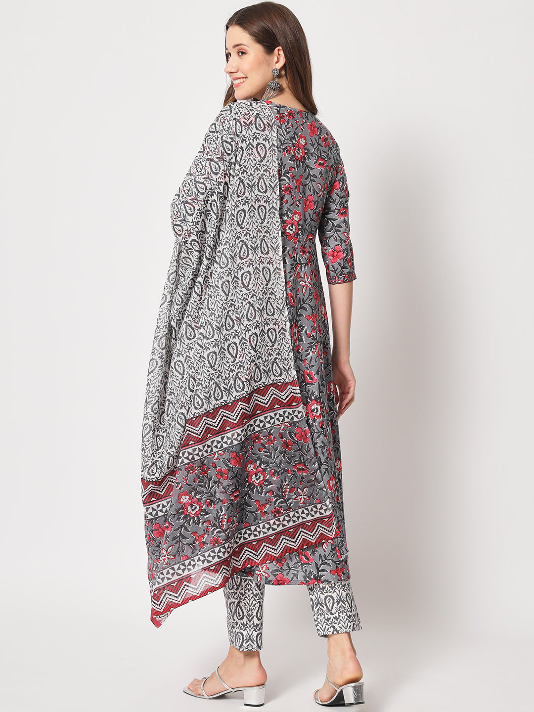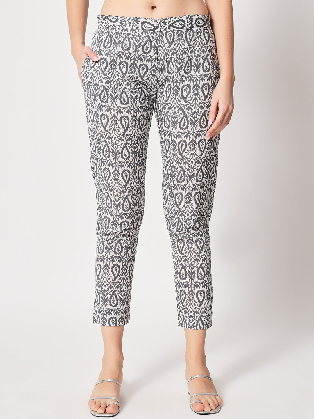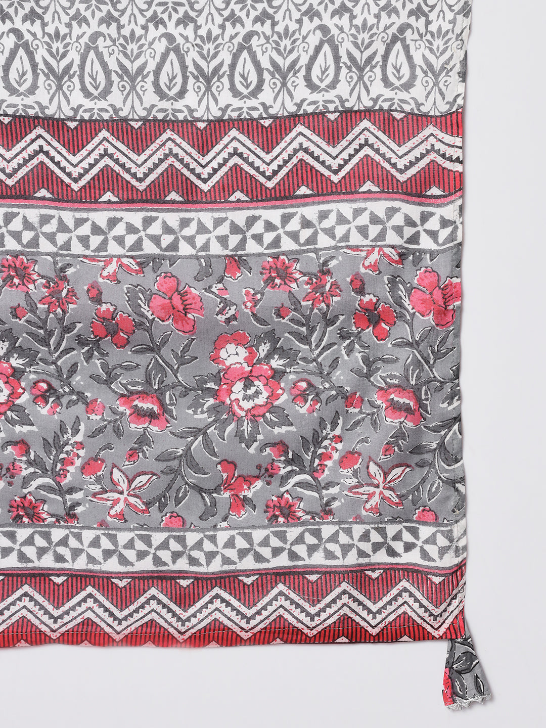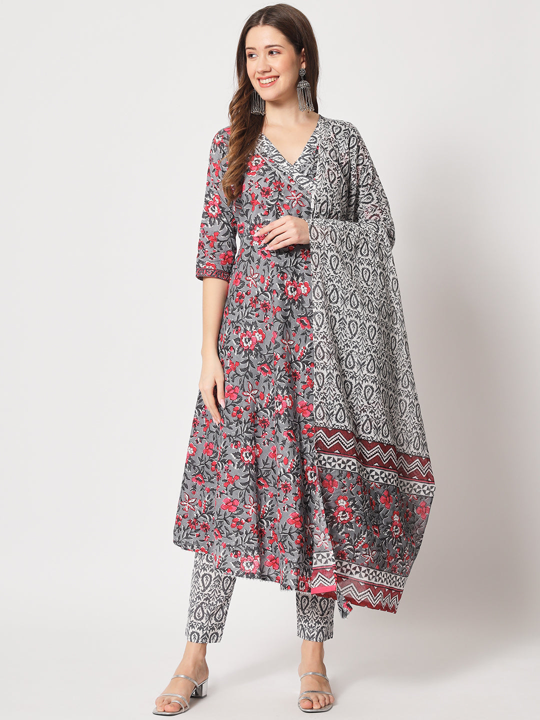 Grey and Pink handprinted high waist flared angrakha kurti with pegged pants.
