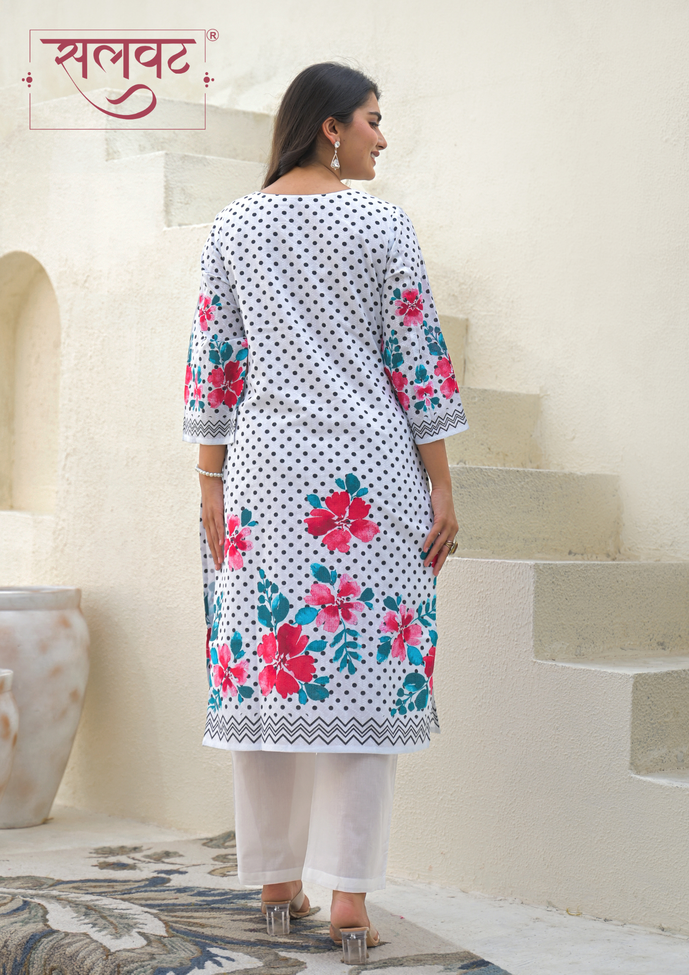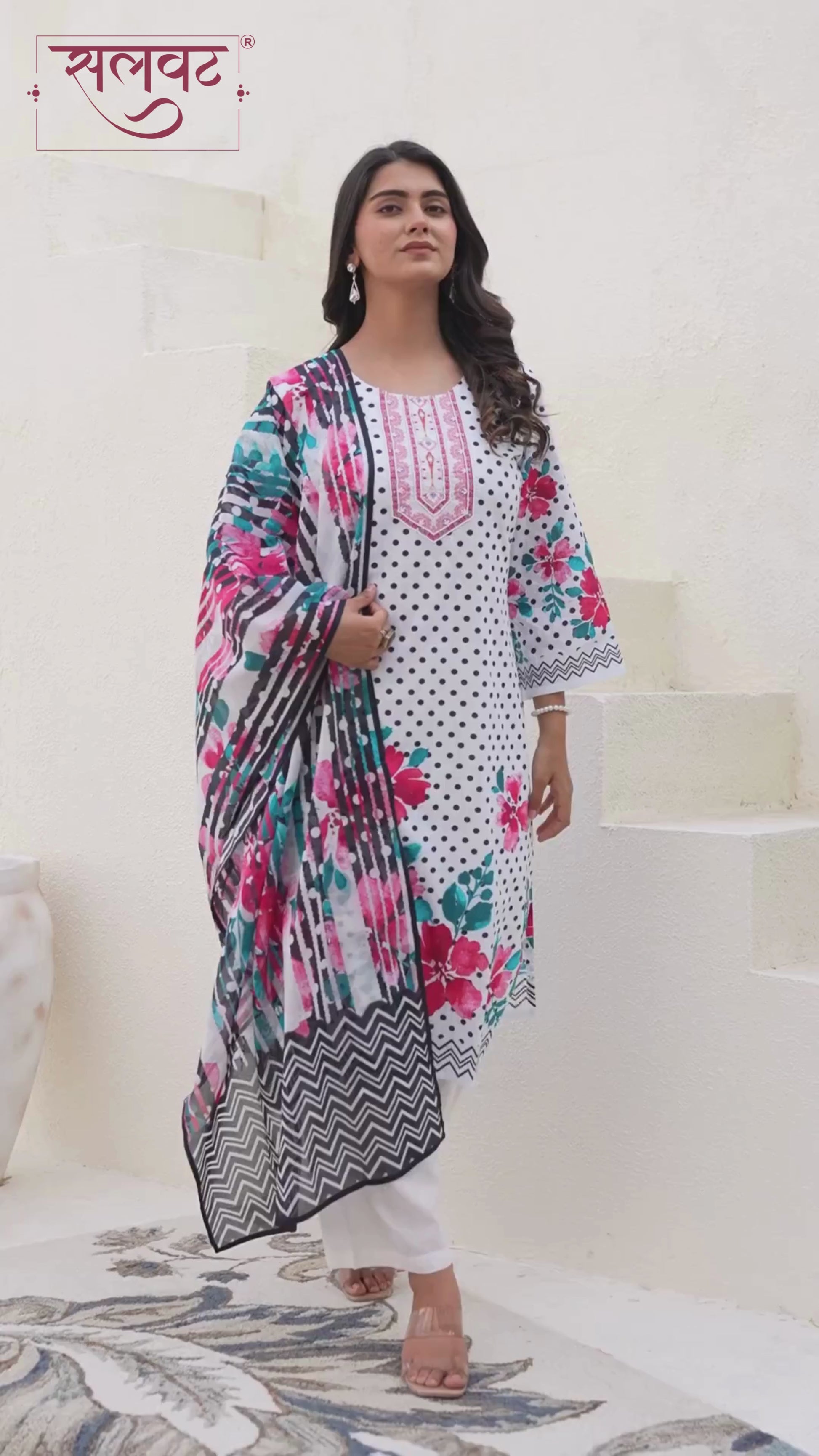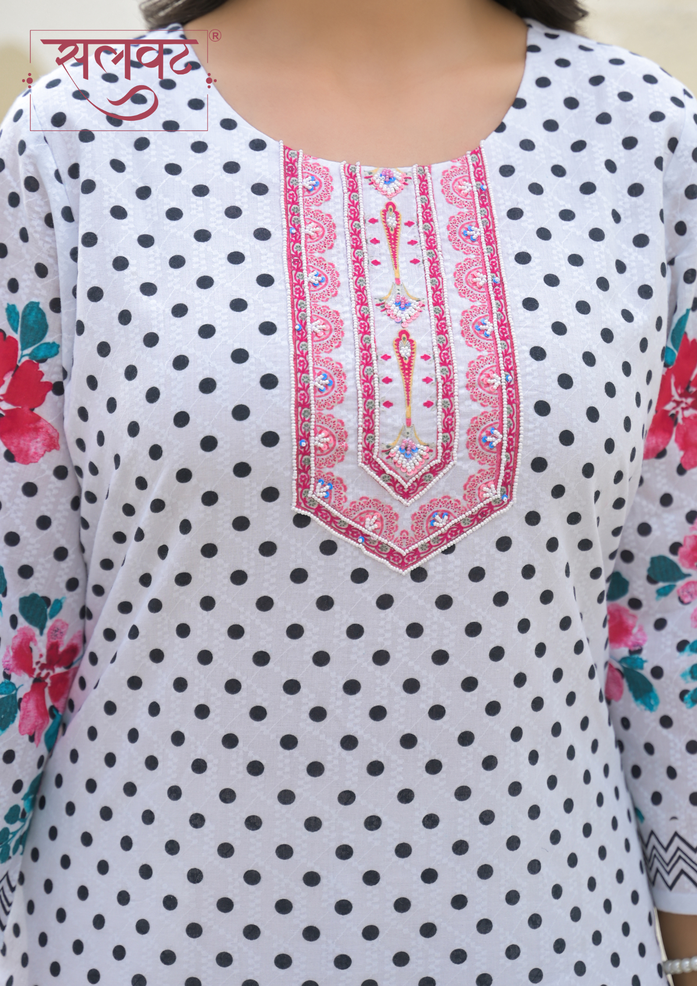 White & Black polka dots with pink flowers printed and beads-sequin handwork on neck, beads-pleats neck work kurta set with digital print dupatta.