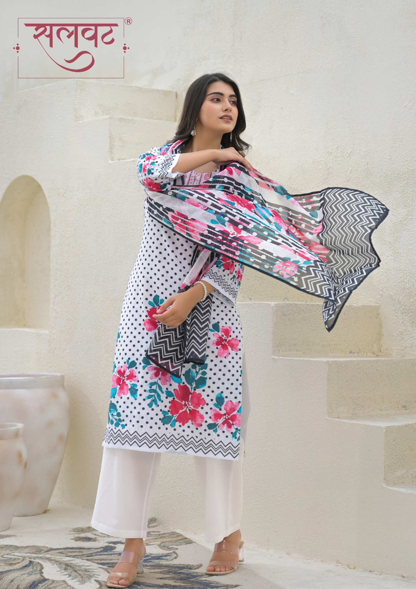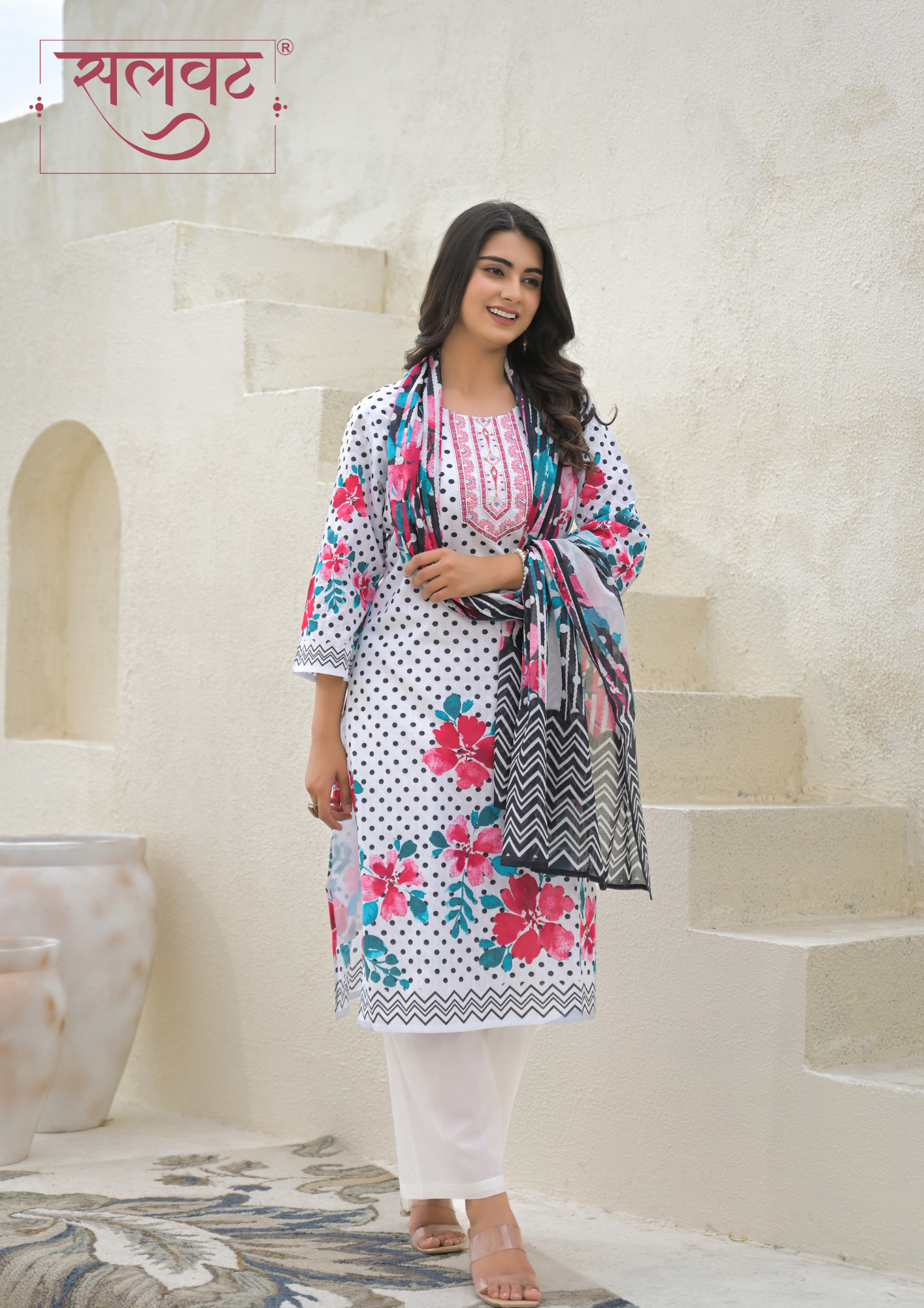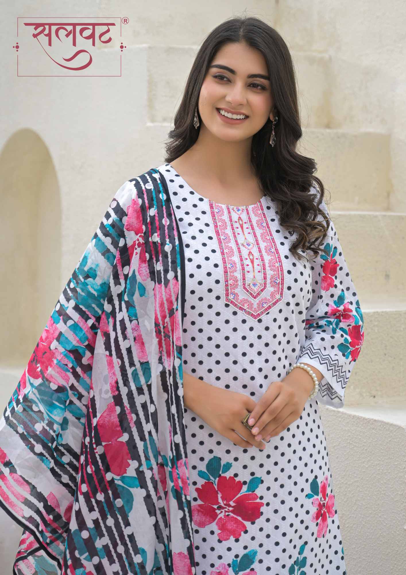 White & Black polka dots with pink flowers printed and beads-sequin handwork on neck, beads-pleats neck work kurta set with digital print dupatta.