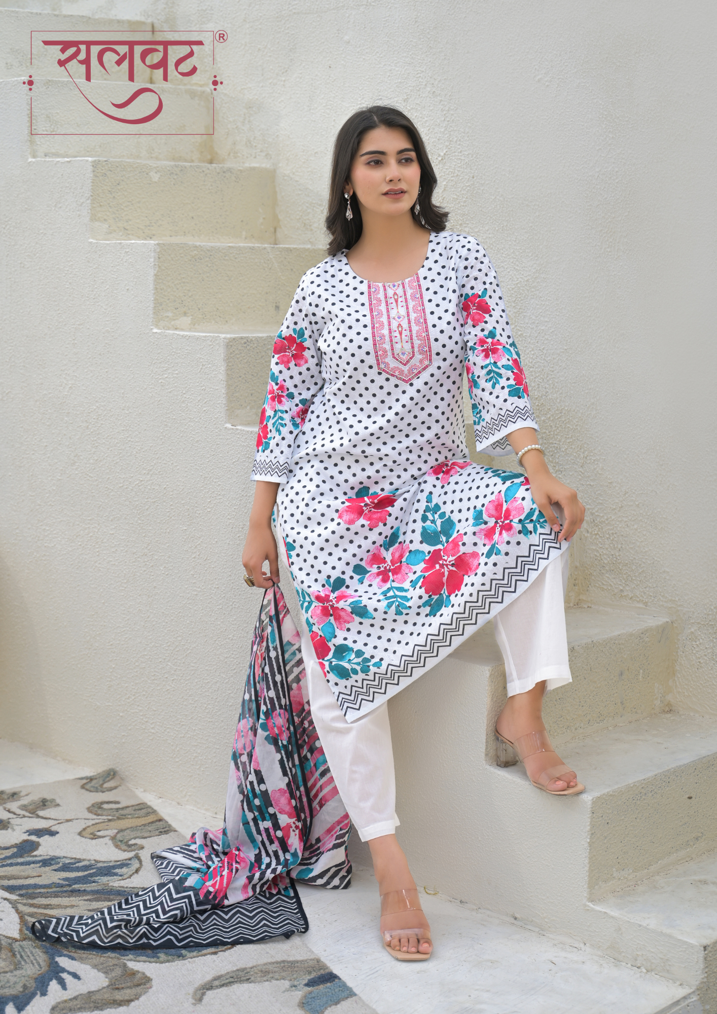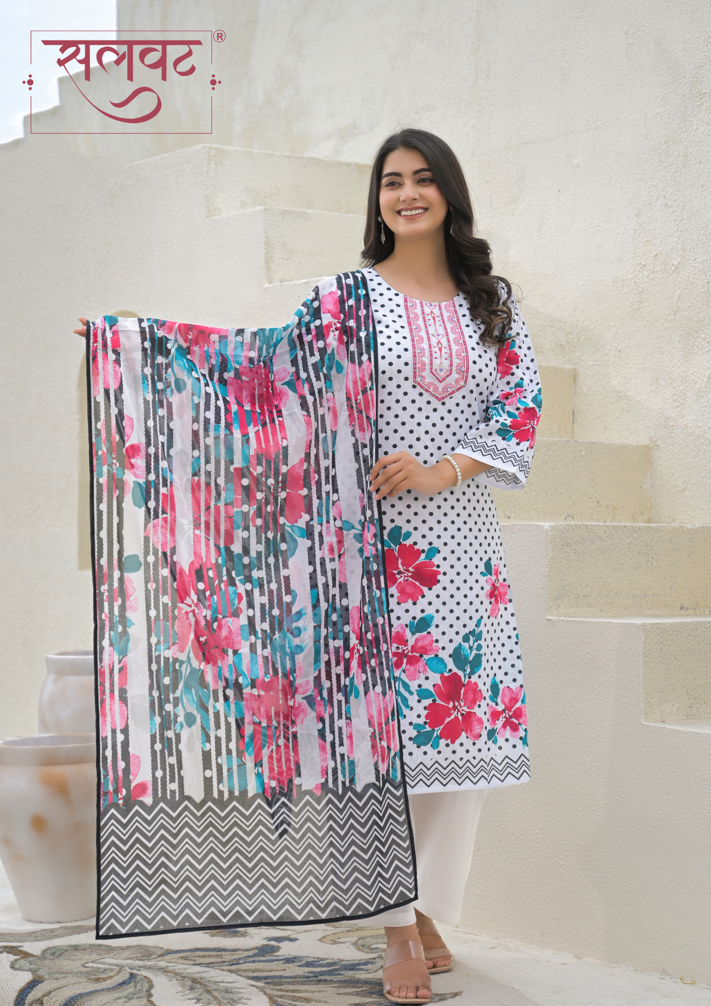 White & Black Polka Dots Printed Handwork Kurta Set With Printed Dupatta