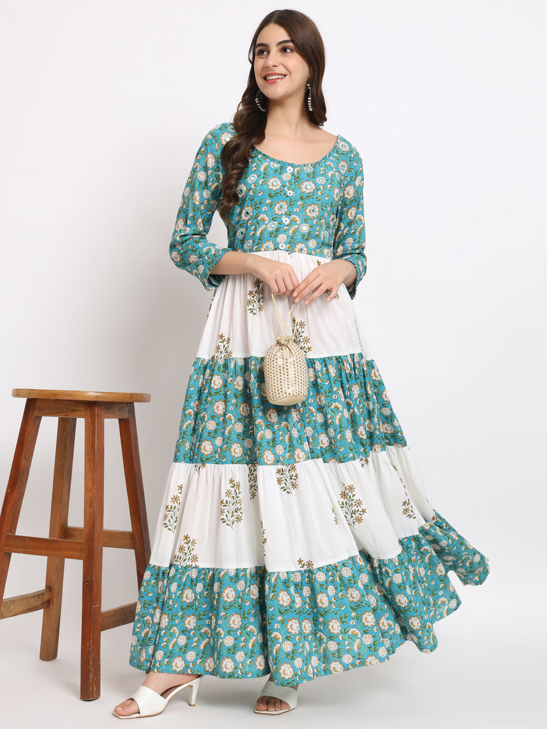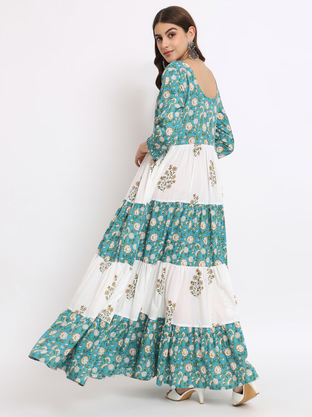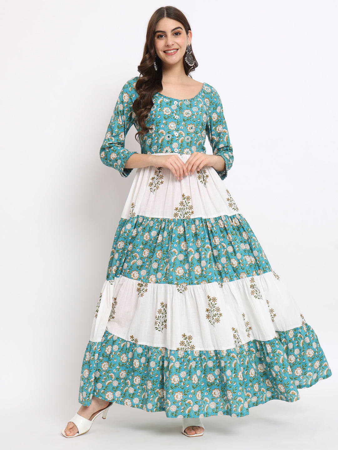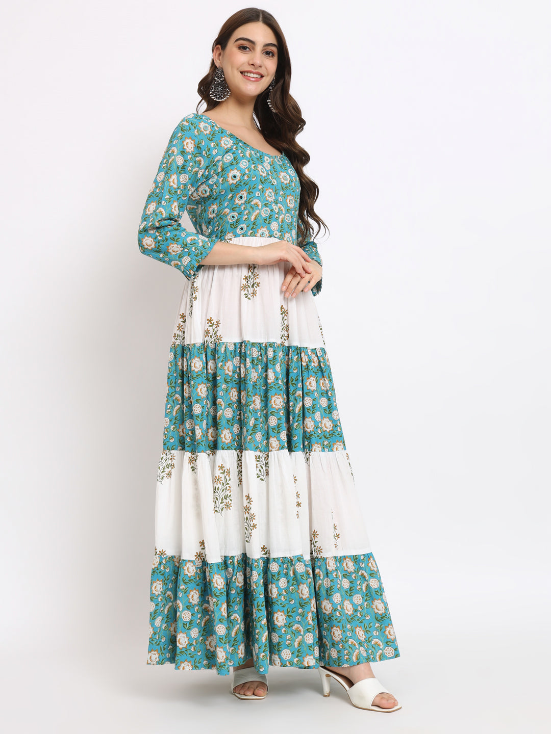 White & blue hand blocked printed tiered maxi dress with embellishments accentuating the yoke.