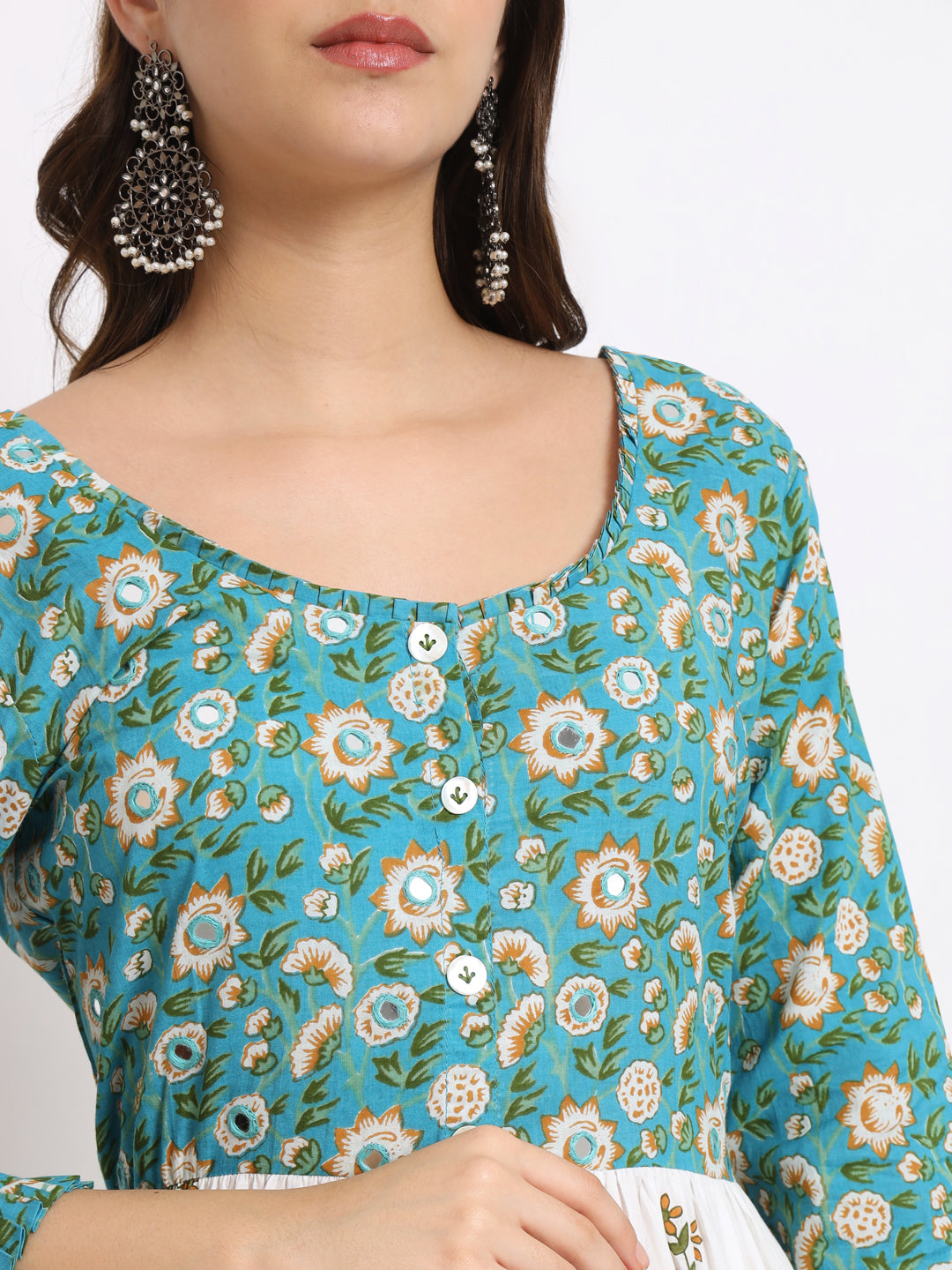 Embellished with blue embroidered mirrors and white buttons with frills on the neckline and sleeves.