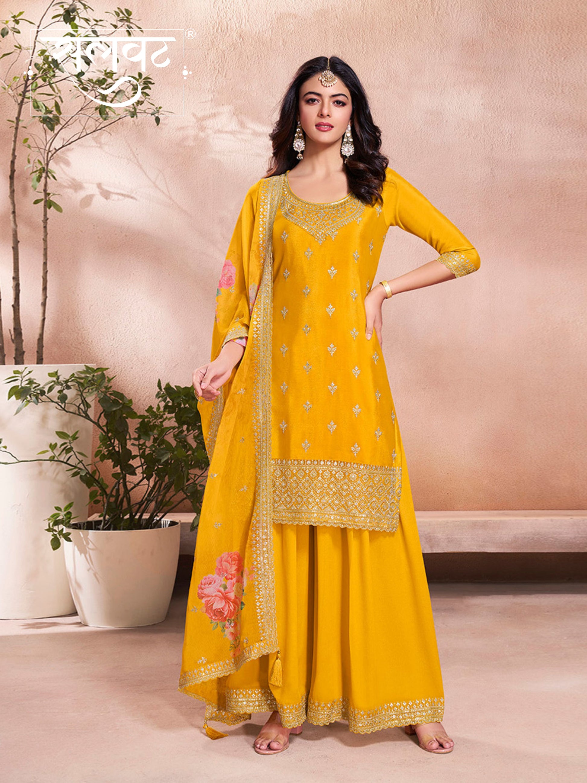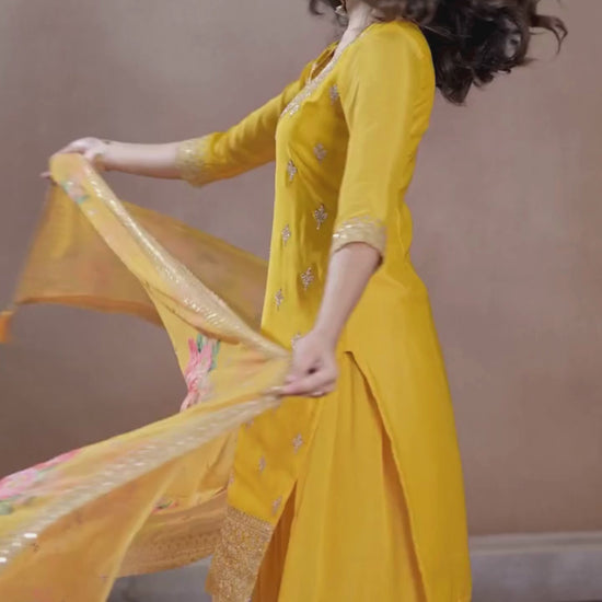 Yellow Chinon Fabric Top with Floral Pattern Sequins work & Heavy Embroidered Border on Daman & sleeves. Paired with Chinon fabric Sharara with Sequins Embroidered and Bemberg Chiffon Digital Floral Printed Dupatta & Four Sided Sequins Embroidered Scalloped Border