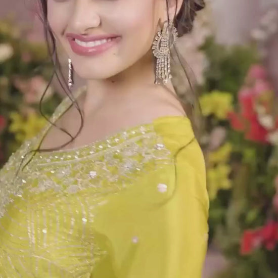 Make a statement with this elegant Yellow Chinon Sharara Suit featuring delicate embroidery and sequins work. The set includes a matching Chinon sharara and a beautifully crafted Chinon dupatta adorned with butti work and scalloped sequin borders, adding charm and grace to any festive or wedding occasion.