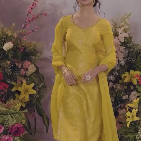 Yellow Chinon Kurta Set with Jacquard and Zari Work, Paired with Viscose Santoon Straight Pants and an Organza Dupatta featuring Jacquard Weaving and a Four-Sided Border.