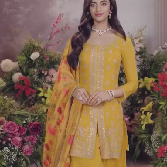 Yellow Russian Silk Kurta With Digital Print Work Paired With Viscose Santoon Straight Pant with Russian Milk Digital Print Contrast Dupatta